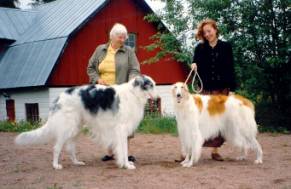 Ödelia came to us at the age of two. She was the "king of the hill" from day one, and no other dog dared challenge her during her lifetime. She was a big and beautiful bitch, and extremely affectionate towards her family-members. She was also the sneakiest of dogs, opening our dear neighbours door waiting for a piece of sausage by the refrigerator until the mission was completed... Furthermore, and above all she was a true hunter. There wasn't a day that went by without her being on a diet, but it was a hopeless cause... If she felt she didn't get enough food at home, she went running in the fields nearby hunting for rabbits which she ate with great appetite. She loved male-dogs and she met her love of her life, Int&Dk Ch BjgSg Zarina's Diavolo, in Denmark in the winter of 1993, when she and Charlotta visited the Danish kennel Zarina's owned by Hjördis Wied-Hansen. In March of 1993 she gave birth to kennel Margiitan's new B-litter in Kaarninko. This litter was to have an utmost important influence on the future kennel Charlotte'russe's borzois, because this is were it all began...